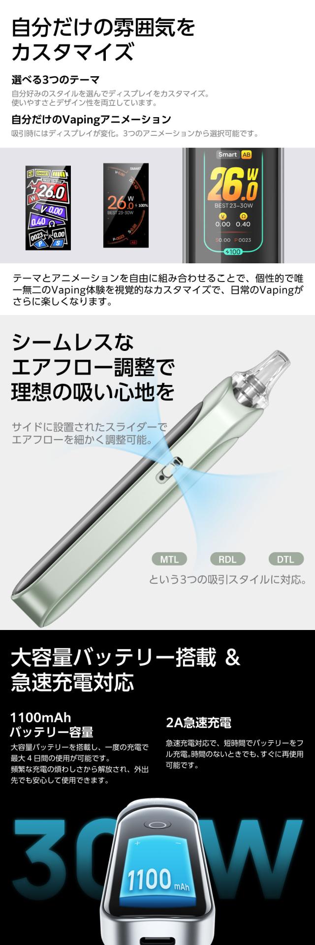 本製品は視認性抜群で操作もしやすい最先端のタッチスクリーン技術を搭載しており、見た目や吸いごたえ、吸い心地など多岐に渡る自分好みのカスタマイズを可能にした次世代の電子タバコとなっております!
