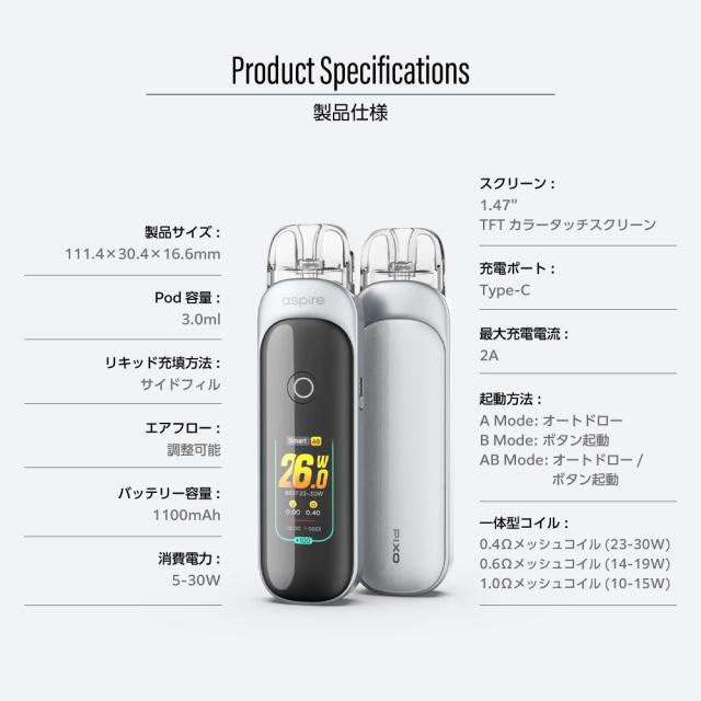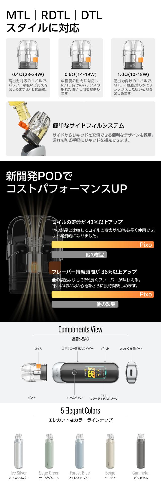 Aspire Pixo 電子タバコ タール ニコチン0 スターターキット 持ち運び シーシャ 電子タバコ ベイプ 使い捨て 本体 アスパイア ピクソー Aspire POD ポッド 水蒸気 おすすめ 電子タバコ VAPE ベイプ リキッド 禁煙 ニコチンゼロ ノンニコチン コンパクト