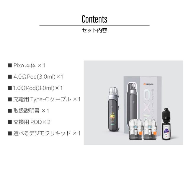 ![]() | ⇒ Aspire Pixo (アスパイア ピクソー)選べるリキッド5本セットはコチラ 選べるリキッドが5本付いたとってもおトクなセット。 |