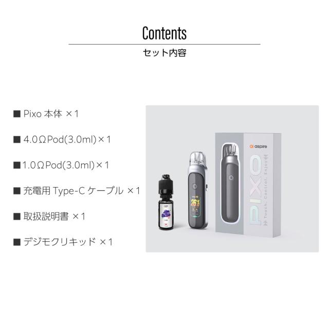![]() | ⇒ Aspire Pixo (アスパイア ピクソー)交換用POD 2個と選べるリキッド1本セットはコチラ 交換用POD2個と選べるVAPOREVERのリキッドが1本付いたとってもおトクなセット。 |