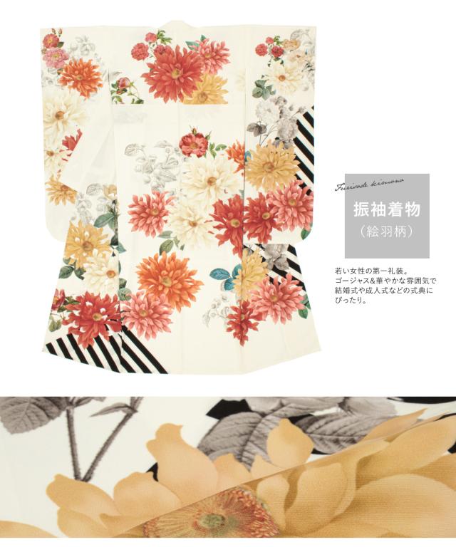 着物は、華やかな花々が散りばめられたデザインです。振袖丈の着物セットなので、成人式での振袖きものとしても着回し可能です。