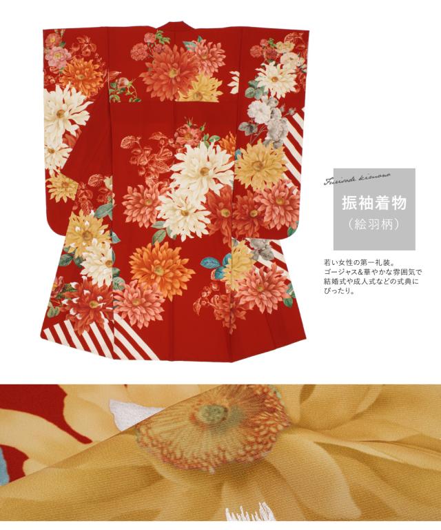 着物は、華やかな花々が散りばめられたデザインです。振袖丈の着物セットなので、成人式での振袖きものとしても着回し可能です。