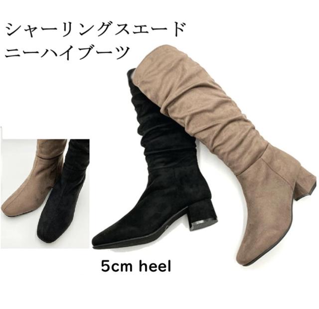 ニーハイブーツ 太めヒール 5cm チャンキーヒール ロングブーツ レディース ブーツ ロング スクエアトゥ くしゅくしゅ シャーリング ロングブーツ おしゃれ きれいめブーツ 歩きやすい 痛くない