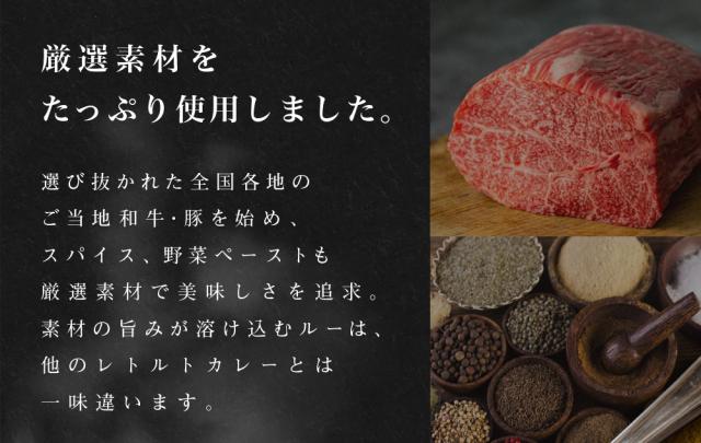 | 〇松阪牛ビーフカレー 野菜(玉ねぎ(国産)、人参)、豚脂、小麦粉、牛肉(三重県産)、砂糖、果実ペースト (マンゴー、りんご)、食塩、カレー粉、トマトペースト、ビーフエキス(小麦・大豆を含む)、トマトピューレ、チャツネ(りんごを含む)、大豆たん白、食用植物油脂(大豆を含む)、野菜ペースト (生姜、にんにく)、香辛料、オニオンパウダー、還元水あめ、酵母エキス、ガーリックパウダー(大豆を含む)/着色料(カラメル、ココア)、増粘剤(加工でん粉)、調味料(アミノ酸等:小麦・大豆由来)、乳化剤、酸味料、香料 〇宮崎牛ビーフカレー 野菜(玉ねぎ(国産)、人参)、豚脂、小麦粉、牛肉(宮崎県産)、砂糖、果実ペースト (マンゴー、りんご)、食塩、カレー粉、トマトペースト、ビーフエキス(小麦・大豆を含む)、トマトピューレ、チャツネ(りんごを含む)、大豆たん白、食用植物油脂(大豆を含む)、野菜ペースト (生姜、にんにく)、香辛料、オニオンパウダー、還元水あめ、酵母エキス、ガーリックパウダー(大豆を含む)/着色料(カラメル、ココア)、増粘剤(加工でん粉)、調味料(アミノ酸等:小麦・大豆由来)、乳化剤、酸味料、香料 〇神戸牛ビーフカレー 野菜(玉ねぎ(兵庫県産)、人参)、豚脂、小麦粉、牛肉(兵庫県産)、砂糖、果実ペースト (マンゴー、りんご)、食塩、カレー粉、トマトペースト、ビーフエキス(小麦・大豆を含む)、トマトピューレ、チャツネ(りんごを含む)、大豆たん白、食用植物油脂(大豆を含む)、野菜ペースト (生姜、にんにく)、香辛料、オニオンパウダー、還元水あめ、酵母エキス、ガーリックパウダー(大豆を含む)/着色料(カラメル、ココア)、増粘剤(加工でん粉)、調味料(アミノ酸等:小麦・大豆由来)、乳化剤、酸味料、香料 〇沖縄石垣島和牛ビーフカレー 野菜(玉ねぎ(国産)、人参)、豚脂、小麦粉、牛肉(沖縄県産)、砂糖、果実ペースト (マンゴー、りんご)、食塩、カレー粉、トマトペースト、ビーフエキス(小麦・大豆を含む)、トマトピューレ、チャツネ(りんごを含む)、大豆たん白、食用植物油脂(大豆を含む)、野菜ペースト (生姜、にんにく)、香辛料、オニオンパウダー、還元水あめ、酵母エキス、ガーリックパウダー(大豆を含む)/着色料(カラメル、ココア)、増粘剤(加工でん粉)、調味料(アミノ酸等:小麦・大豆由来)、乳化剤、酸味料、香料 〇鹿児島黒豚ポークカレー 野菜(玉ねぎ(国産)、人参)、豚脂、小麦粉、豚肉(鹿児島県産)、砂糖、果実ペースト (マンゴー、りんご)、食塩、カレー粉、トマトペースト、ビーフエキス(小麦・大豆を含む)、トマトピューレ、チャツネ(りんごを含む)、大豆たん白、食用植物油脂(大豆を含む)、野菜ペースト (生姜、にんにく)、香辛料、オニオンパウダー、還元水あめ、酵母エキス、ガーリックパウダー(大豆を含む)/着色料(カラメル、ココア)、増粘剤(加工でん粉)、調味料(アミノ酸等:小麦・大豆由来)、乳化剤、酸味料、香料 |