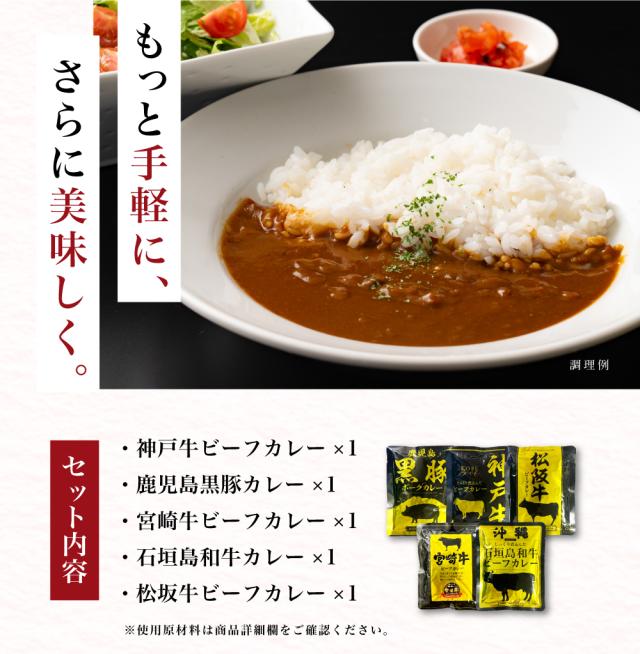 送料無料 贅沢カレー5食(160g×5) 5種食べ比べ レトルトカレー 和牛 黒豚 神戸牛 宮崎牛 石垣島和牛 松坂牛 ポイント消化 お試し ポイント消費 食品 グルメ 非常食 保存食 防災食 長期保存 仕送り 非常用 防災 備蓄 簡単 便利 どんまい