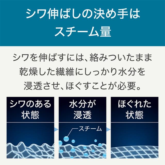 ・シワ伸ばしの決め手はスチーム量。平均 23 g/ 分(※ 1)のパワフル 連続 スチームが 繊維の奥まで浸透し、 シワの原因(からみついた状態で乾燥した繊維)をしっかりほぐし、シワが きれいに伸ばせます。