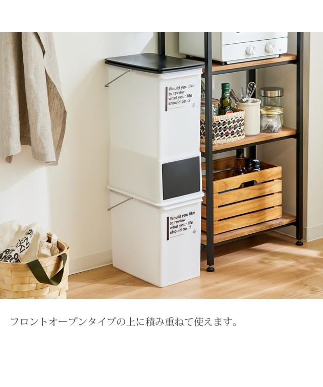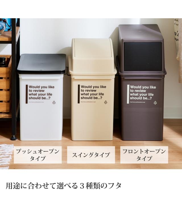 フタが3種類から選べる自分好みに使えるダストボックス。フロントの扉がスイングするフロントオープンタイプ、ワンタッチで開閉するプッシュタイプ、上面がスイングするスイングタイプの3種類の投入口です。フロントタイプを下に設置すると積み重ねして2段使いすることもできます。