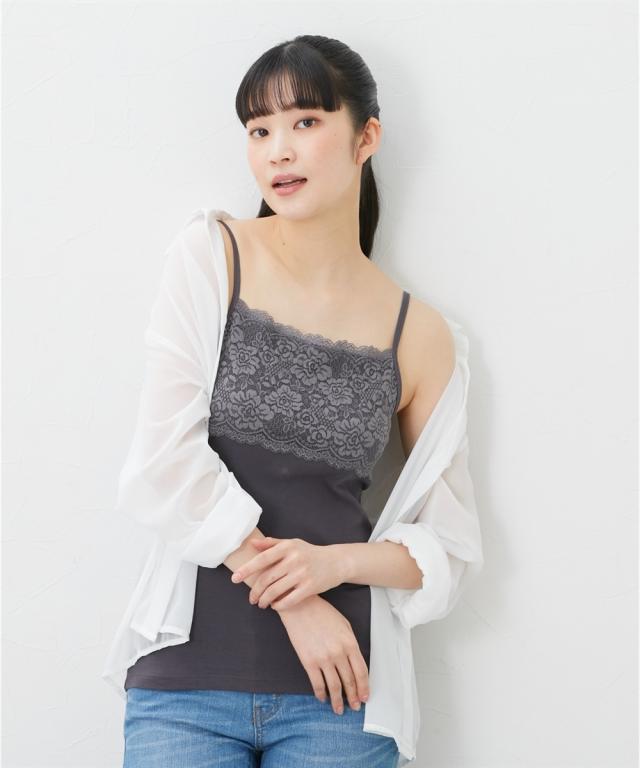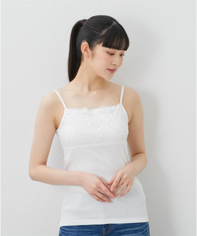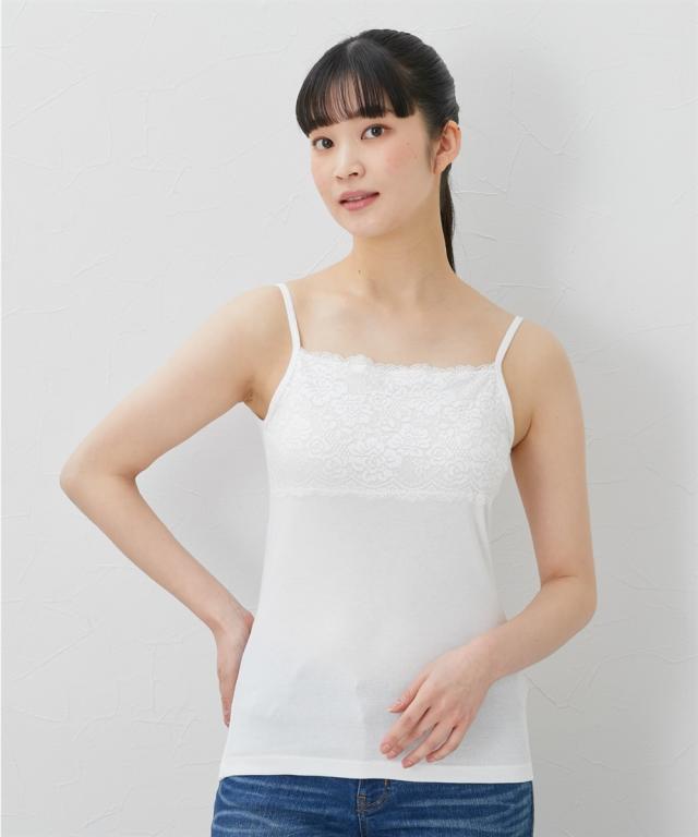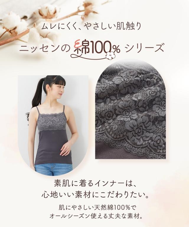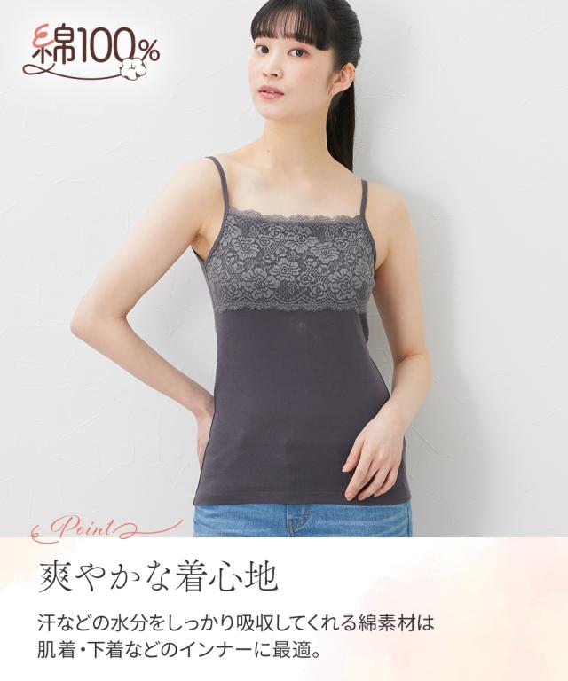 お肌に優しい綿100%フライスインナー 素肌に直接触れるインナーだからこそ、通気性良く肌ざわりのやさしい綿100%をおすすめします。 <天然素材100%> 天然素材コットン100%のインナーは、通気性や吸水性に優れており、さらりと快適な着心地が特徴です。 汗ばむ季節は、吸湿性により汗をすばやく吸収してさらりとした着心地を保ち、冬は保温性により暖かいため、一年を通して、快適に着用できます。 ふんわりとした優しい肌触りで下着の刺激やムレが気になる方にもおすすめです。 <着心地のよい素材> フライス素材ならソフトに横伸びして快適な着心地。 心地よい柔らかさでソフトな風合いが魅力です。 胸元にレースをあしらった華やぎキャミソール。アウターからチラっと見せてもエレガントで、重ね着にも重宝するデザイン。 <こんな方におすすめ> ○お肌に優しい素材 ○通年着られる ○セットでお得 ○豊富なサイズ展開 同シリーズのタンクトップもチェック。※商品の色移りを防止するために個包装を行っている場合がございます。 個包装はプラスチック削減のため一部の色のみに使用しています。