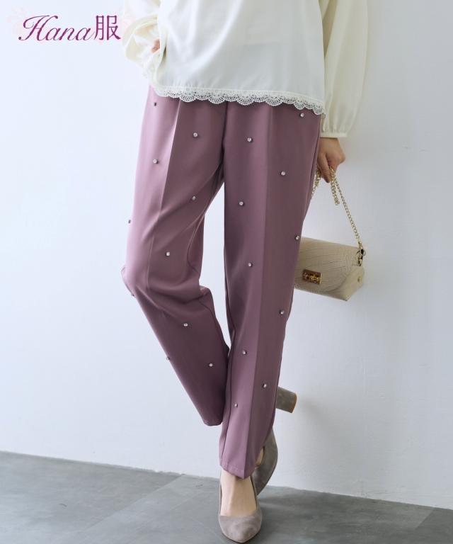 【Hana服】時を重ねて輝く女性のための大人ファッション きらきらビジューが目を引く主役級パンツ ■デザイン ・すっきりとしたテーパードシルエットが足元を美しく見せてくれます。 ・後ろゴムなので履き心地抜群 フロントデザインもすっきりみせてくれます。 ・センタープレスデザインが足を立体的に見せてくれるので、スタイルよくみせてくれます。 ■素材 さらっとした履き心地の布帛素材。 ■おすすめのスタイリング 幅広いサイズ感のトップスとバランスマッチするパンツで、日常使いから特別なシーンまで幅広く活躍します。