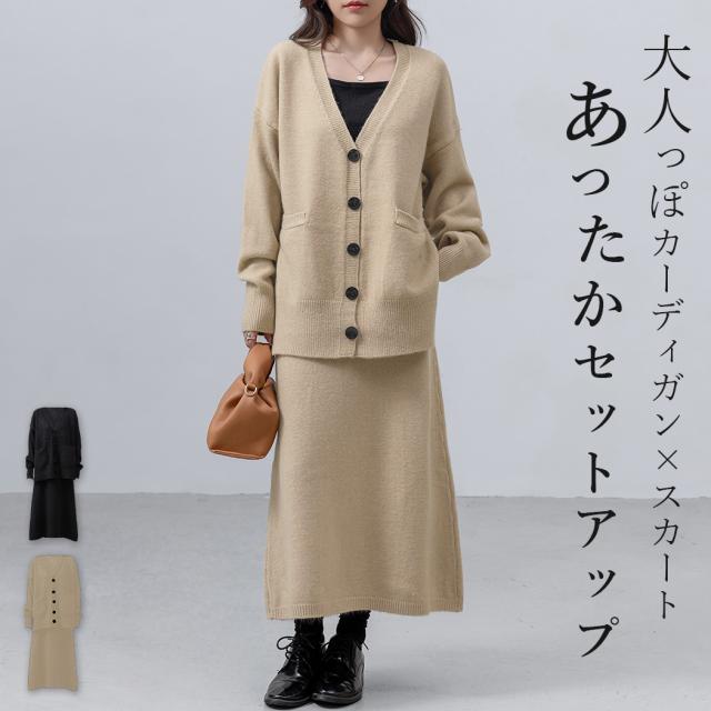 秋新作 「トップス次第で印象変化」ニット セットアップ スカート 長袖 カーディガン 2点セット レディース きれいめ ゆったり Vネック 襟 袖口 裾 リブ ポケット ドロップショルダー フロントボタン ウエストゴム オーバーサイズ 中厚手 秋冬