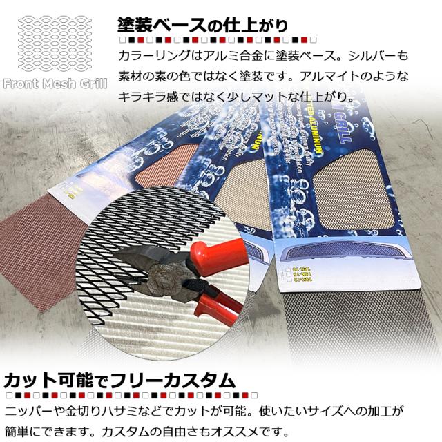| 仕様・注意事項 | 錆びにくいアルミ製でグリルやダクトのエアロ加工に最適です。 ニッパー等で簡単にお好みのサイズにカット可能です。 ・モニター発色の具合により、実物とは色合いが異なる場合がございます。 |