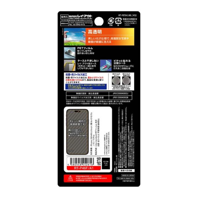 軽くてしなやか、割れない安心素材のPETフィルム。貼り付けがスムーズに行える二段階仕様。美しい光沢仕様で、高画質な写真や動画が綺麗に見える。ウイルスの数を減少させ、製品を清潔に保つことができます。SIAAの安全性基準に適合。レイ・アウト製ケース(別売)と一緒に使用しても干渉しない設計。