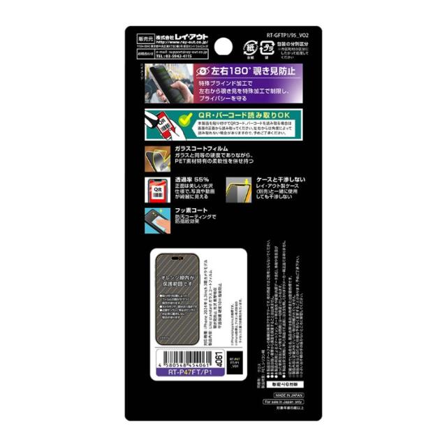 ガラスと同等の硬度でありながら、PET素材特有の柔軟性を併せ持つガラスコートフィルム。フィルムを厚くすることで、不意な衝撃から画面を保護。超防指紋効果で、滑らかな指すべりを実現。乾拭きで画面の汚れが落ちやすい。美しい光沢仕様で、高画質な写真や動画が綺麗に見える。左右からの覗き見を特殊加工で制限し、プライバシーを守ります。