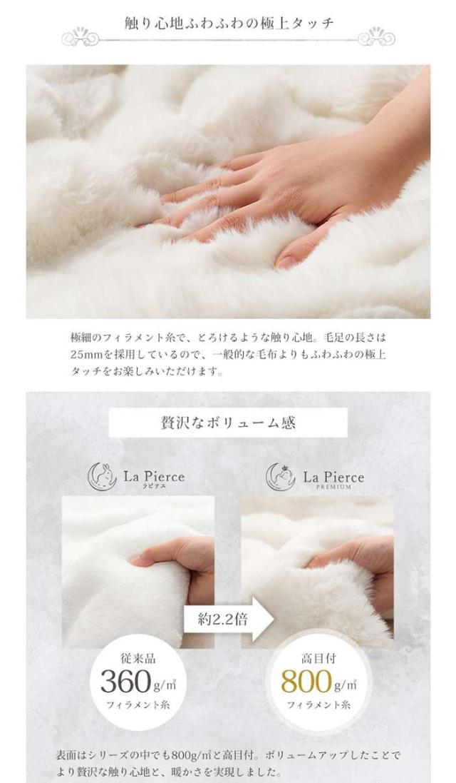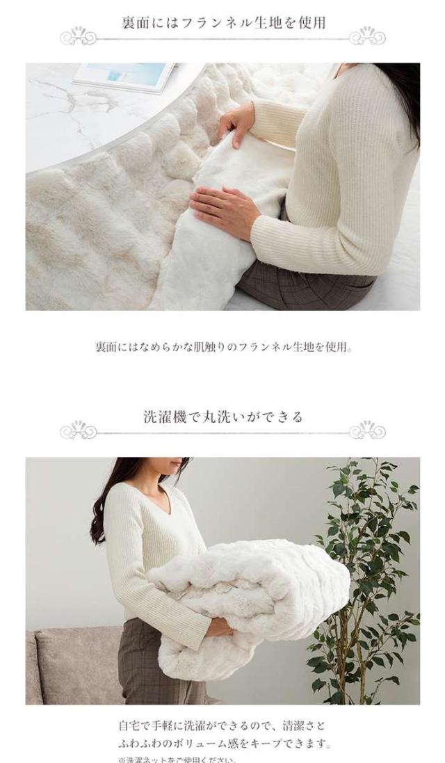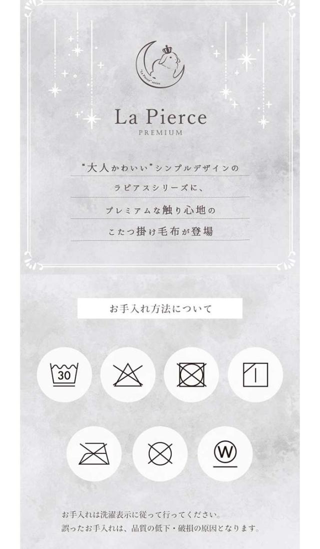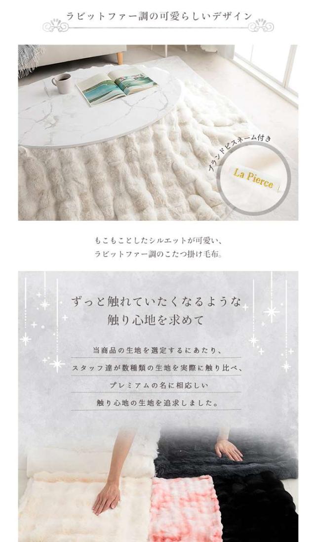 大人かわいいシンプルデザインのラピアスシリーズに、プレミアムな触り心地のこたつ掛毛布が登場。もこもことしたシルエットが可愛い、ラビットファー調のこたつ掛け毛布です。当商品の生地を選定するにあたり、担当者が数種類の生地を実際に触り比べ、プレミアムの名に相応しい触り心地の生地を追及しました。極細のフィラメント糸で、とろけるような触り心地です。毛足の長さは25mmを採用しているので、一般的な毛布よりもふわふわの極上タッチをお楽しみいただけます。表面はシリーズの中でも高目付です。ボリュームアップしたことでより贅沢な触り心地と、暖かさを実現しました。中綿なしでも生地に重みがあり、暖かいのでブランケットとしてもお使いいただけます。小さなお子様がいるご家庭でも安心な乳幼児基準値をクリア。お子様にも安心の低ホルムアルデヒド商品です。キルトなしの2枚合わせこたつ掛け毛布なので、もこもこのデザインを崩さず可愛さをキープ。裏面にはなめらかな肌触りのフランネル生地を使用しています。自宅で手軽に洗濯ができるので、清潔さとふわふわのボリューム感をキープできます。優れた技術と整備された施設で、徹底的な管理体制の元生産された安心の品質です。オフシーズンには毛布をしまっておけるケース付きで、収納も困りません。