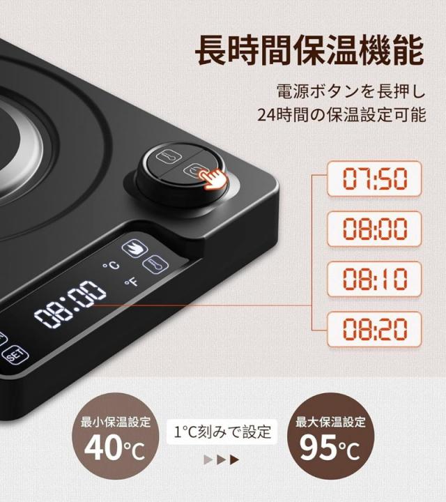 精度1℃まで温度調節が可能なドリップ式の高機能電気ケトルです。調節範囲は、40〜100℃と広範囲の温度調節が可能です。嬉しい最大24時間の保温機能付き!温度は45〜95度まで設定可能。また、ワンタッチで保温設定に切り換わります。