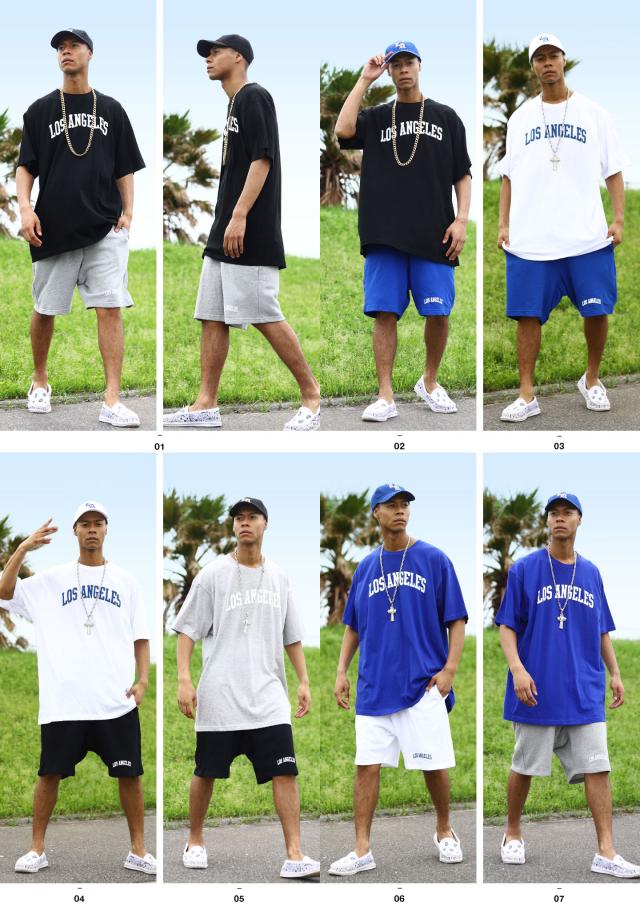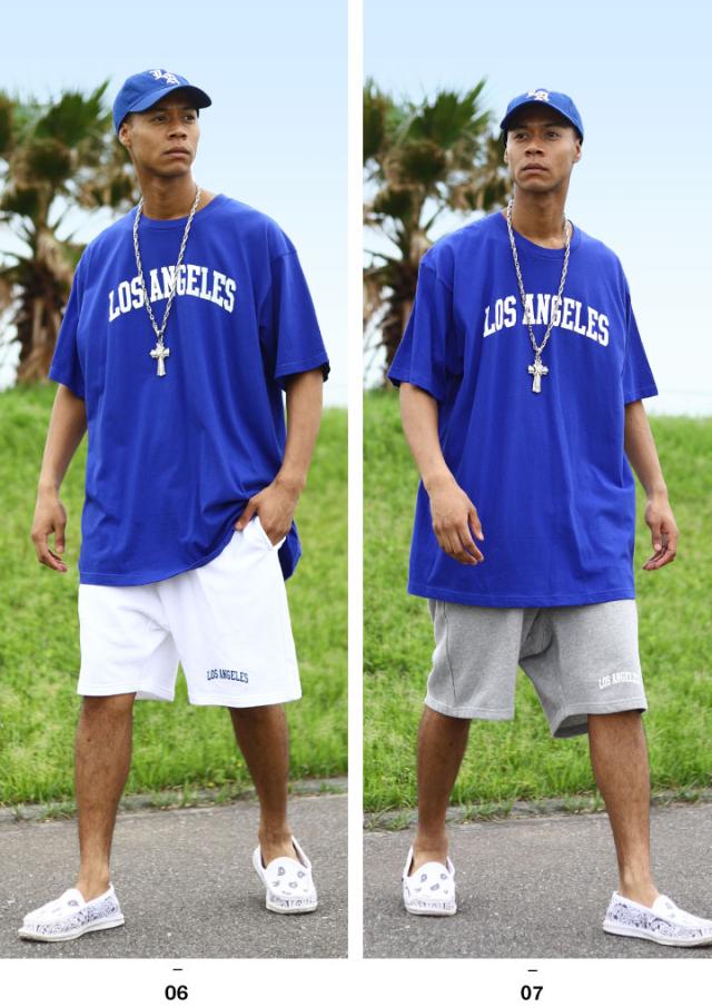 LA(エルエー)の 略称で馴染み深い「Los Angeles」ロゴをドロップした、Tシャツとスウェットハーフパンツの上下セット。