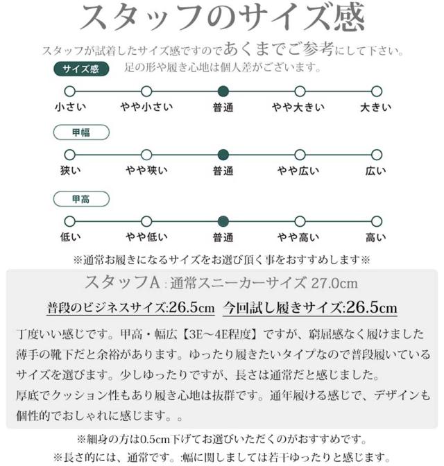 | 【サイズ】 | 25.0cm 25.5cm 26.0cm 26.5cm 27.0cm 28.0cm ■おすすめのサイズ:細身・普通の方→「0.5cm小さめ」 ■甲高、幅広の方→「標準サイズ」 こちらのアイテムの足入れは若干大きめです |