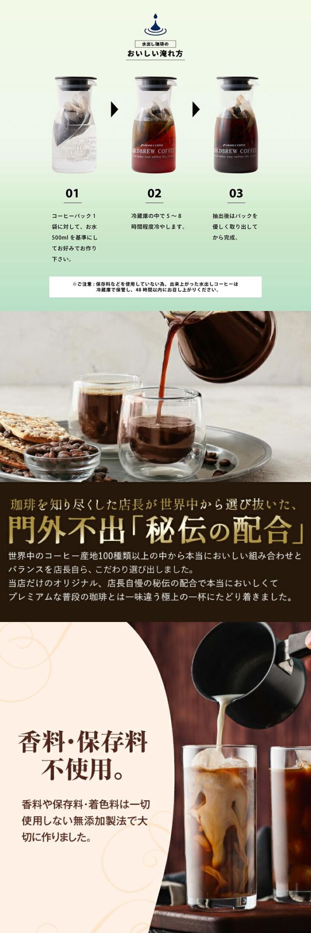 | 内容量 | ●水出し珈琲パック(1パックあたり35g) ・ソルブレンド 10パック入り×1袋 ・ルナブレンド 10パック入り×1袋 |