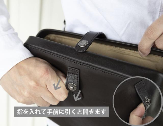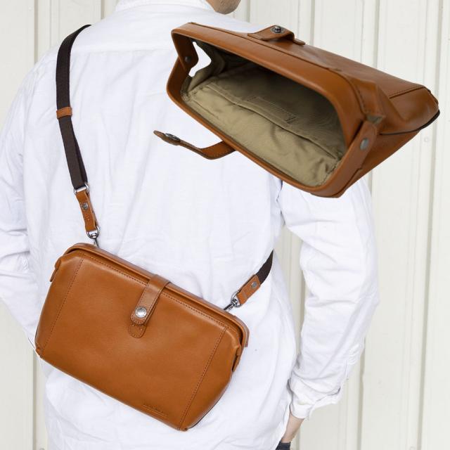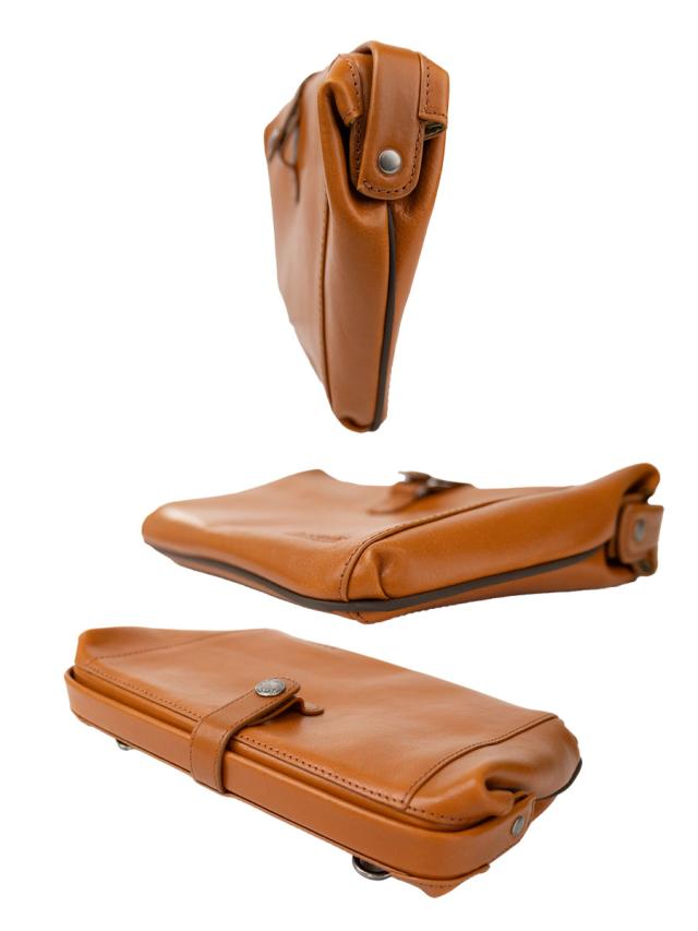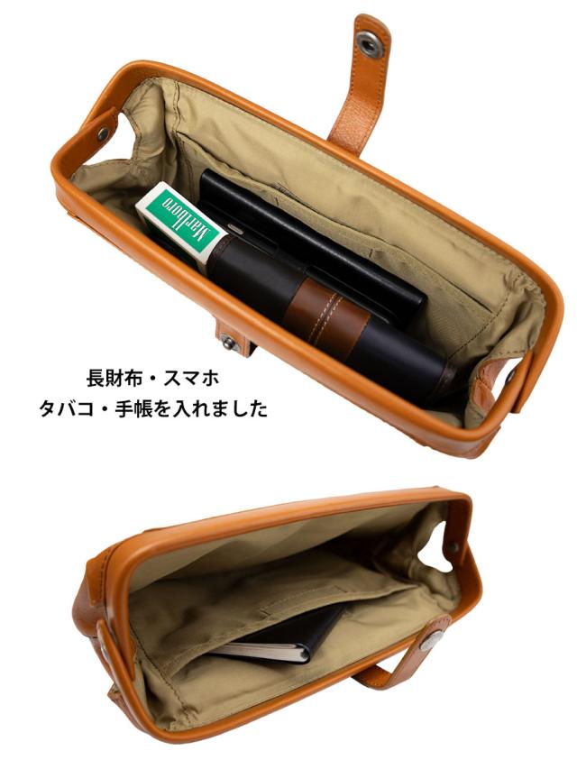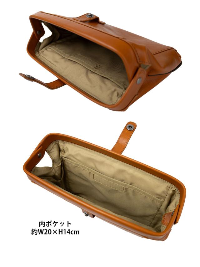 口枠を開口部に使ったダレス型のレザーバッグです。ハンドストラップでクラッチ、ポーチとして、ベルトに付け替えてショルダーバッグとして2WAYでお楽しみいただけます。