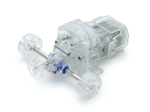 完成時の全長63mm、全幅29.8mm、全高27.8mm、出力シャフト部の幅13.4mm。 130タイプモーターつき。 ギヤ比 102.4:1・273.1:1・728.2:1 (3mm六角シャフトの場合)、8.5:1・22.8:1・60.7:1 (2mmシャフトの場合)。 3mm六角シャフト用と2mmシャフト用のクランクプレート、取り付け用のビスやナットもセット。