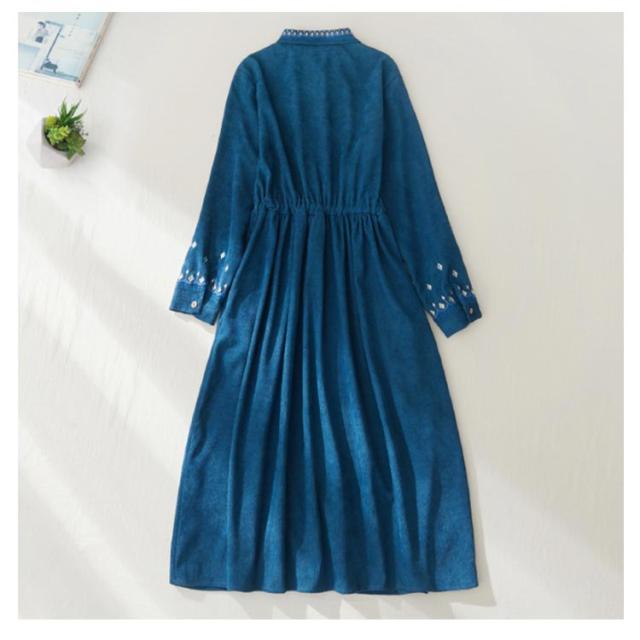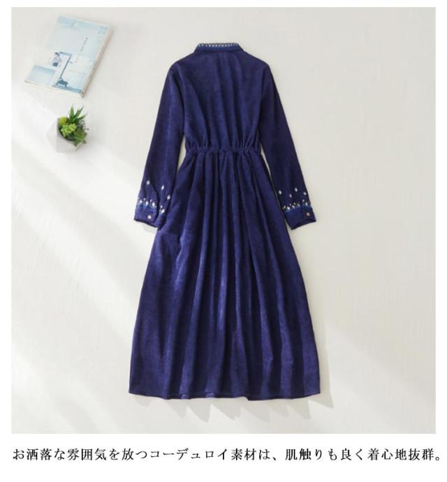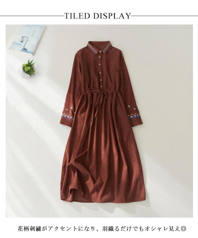 花柄刺繍 コーデュロイ ワンピース シャツワンピース ロング丈 刺繍 無地 ワンピ ゆったり ボタン 着痩せ ウエストリボン ボリューム袖 長そで ロングシャツ シャツワンピース 羽織り 20代 30代 40代 50代 送料無料 春 秋 ブルー グリーン ブラウン
