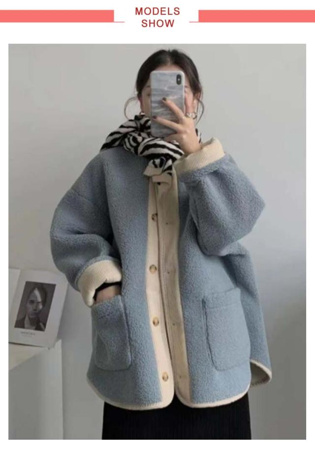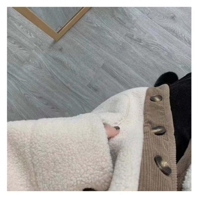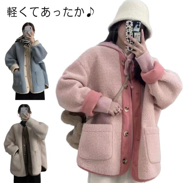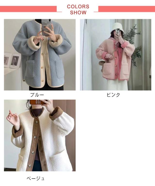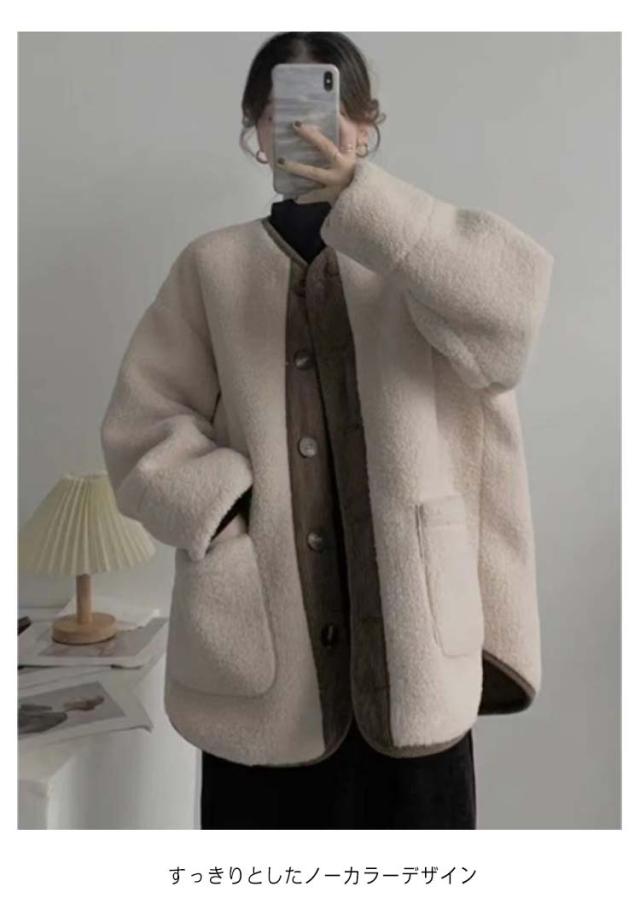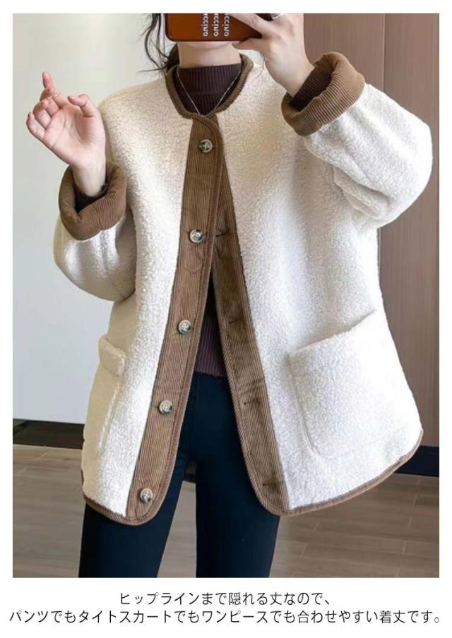 ボアアウター コート レディース アウター ジャケット ノーカラー 上着 ブルゾン 羽織り 長袖 異素材 切り替え コーデュロイ フロントボタン ポケットあり バイカラー 配色 ゆったり かわいい
