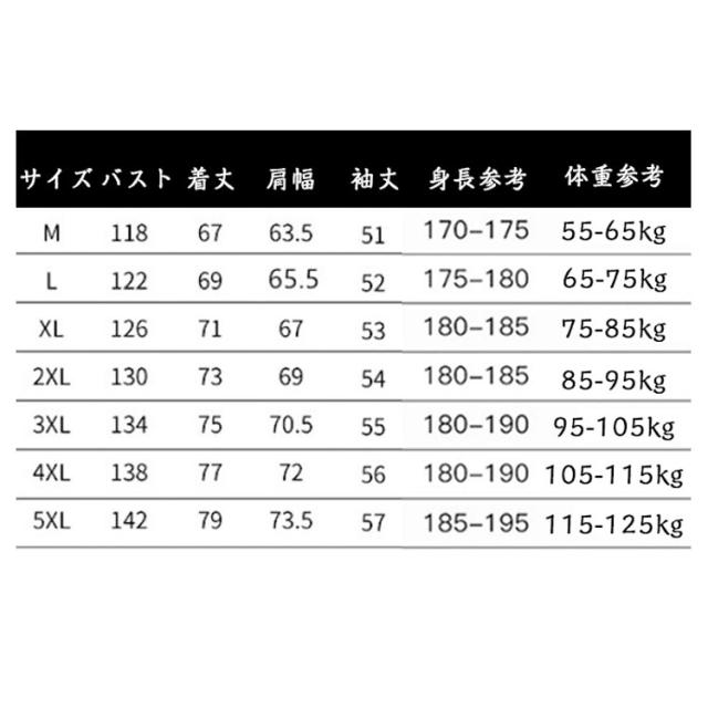 | サイズについての説明 | M バスト(118cm) 着丈(67cm) 肩幅(63.5cm) 袖丈(51cm) 身長参考(170-175cm) 体重参考(55-65kg) L バスト(122cm) 着丈(69cm) 肩幅(65.5cm) 袖丈(52cm) 身長参考(175-180cm) 体重参考(65-75kg) XL バスト(126cm) 着丈(71cm) 肩幅(67cm) 袖丈(53cm) 身長参考(180-185cm) 体重参考(75-85kg) 2XL バスト(130cm) 着丈(73cm) 肩幅(69cm) 袖丈(54cm) 身長参考(180-185cm) 体重参考(85-95kg) 3XL バスト(134cm) 着丈(75cm) 肩幅(70.5cm) 袖丈(55cm) 身長参考(180-190cm) 体重参考(95-105kg) 4XL バスト(138cm) 着丈(77cm) 肩幅(72cm) 袖丈(56cm) 身長参考(180-190cm) 体重参考(105-115kg) 5XL バスト(142cm) 着丈(79cm) 肩幅(73.5cm) 袖丈(57cm) 身長参考(185-195cm) 体重参考(115-125kg) ※測定方法によって誤差が生じますので、予めご了承下さい。 |