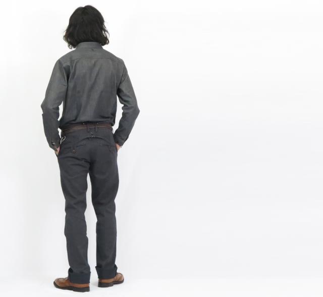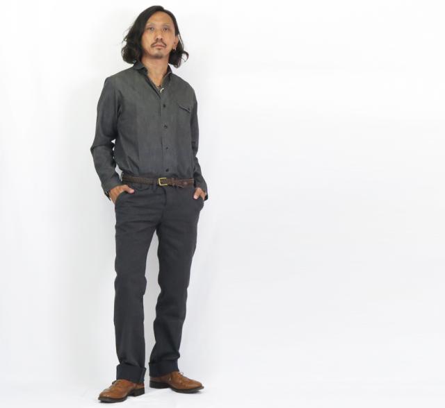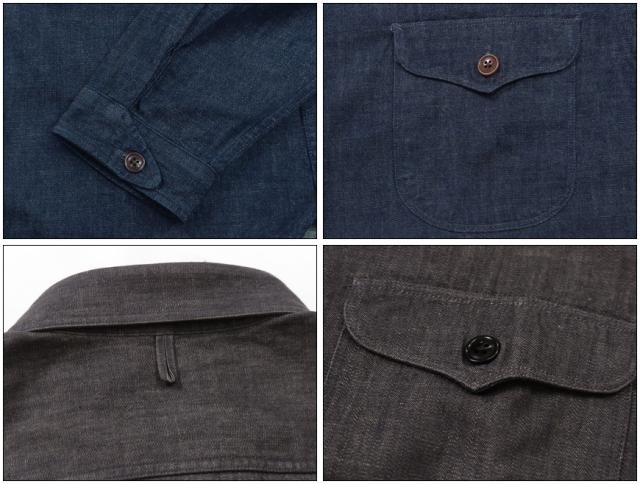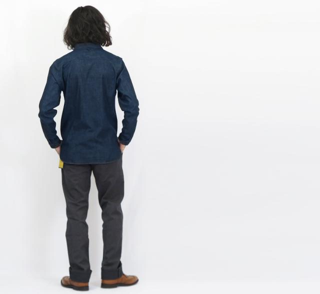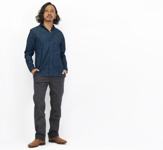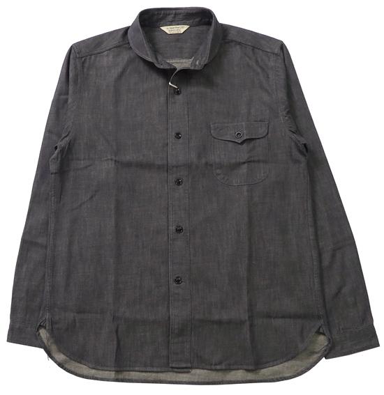 オルゲイユの定番、クラシカルな雰囲気のショールカラーシャツ、OR-5107をベースにデニム生地でアレンジ。