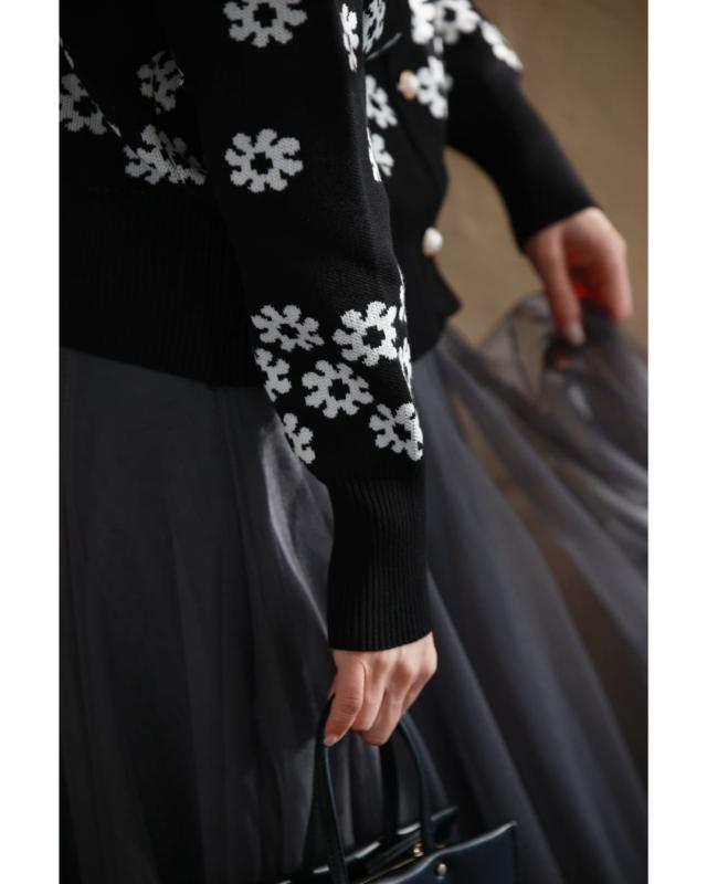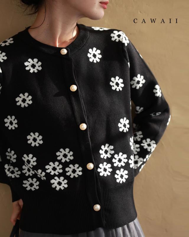 w50488nc 新作 新着 再入荷 CAWAII FRENCHPAVE フレンチパヴェ エレガント ベーシック カジュアル 可愛い かわいい カワイイ おしゃれ オシャレ お洒落 個性 個性的 定番 ベーシック 大人かわいい 大人可愛い 上品 女性らしい デザイン スタンダード ナチュラル きれいめ キレイめ シンプル フェミニン レディース レディースファッション 大人 ママ ミセス 30代 40代 50代 60代 黒 降り積もる 白花 ニット カーディガン 羽織り 長袖 長そで ロング袖 丸首 クルーネック 前ボタン パールボタン 短丈 スタイルアップ 脚長効果 モノトーン ワンサイズ Sサイズ Mサイズ Lサイズ フリーサイズ フリー 小さめ 小さめサイズ小さい 小さいサイズ 低身長 痩せ ほっそり 小柄 細身 標準サイズ 大きめシルエット 大きい 大きめ ビッグシルエット ぽっちゃり オーバーサイズ ゆったり F サイズ自由 春 秋 冬 秋服 秋物 冬服 冬物 着回し 重ね着 レイヤード 伸びる 伸縮性 ブラック 黒 黒色 花柄 フラワー 柄 総柄 花 フラワー柄 日常着 普段着 日常使い ヘビロテ 毎日 おでかけ 旅行 休日 女子会