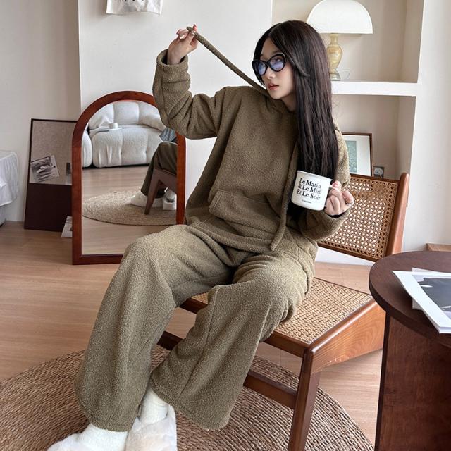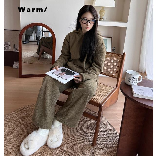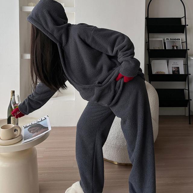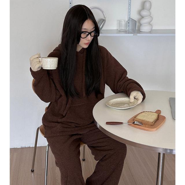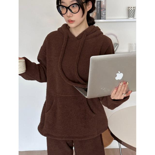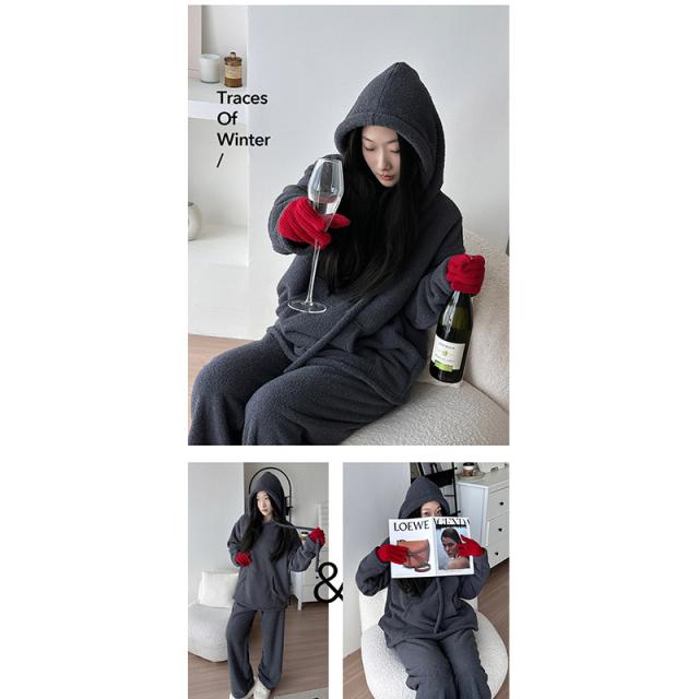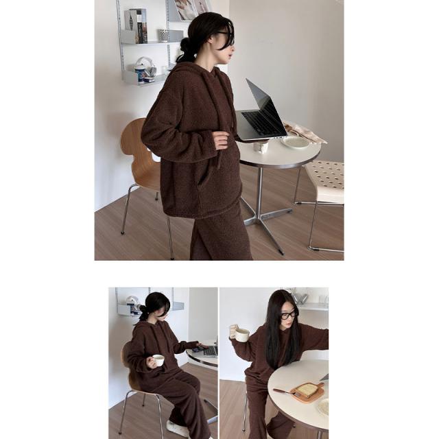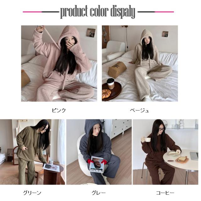 長袖秋冬 ルームウェア 裏起毛 フード付き 部屋着セットアップ フリーススウェット もこもこ クルーネックトップス パンツ 厚手