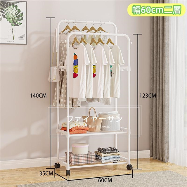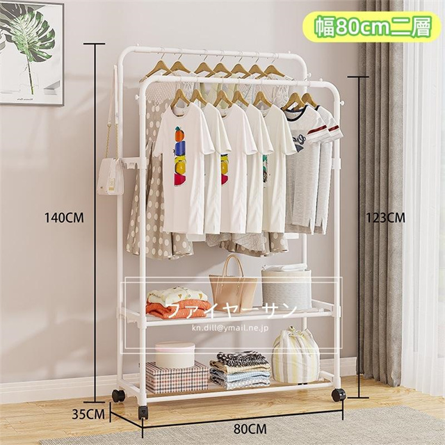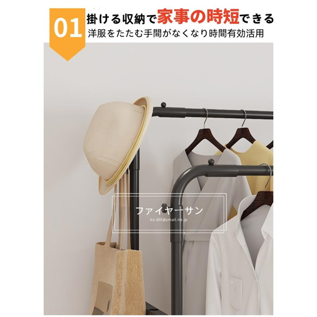 1.二段ラック:ハイとローハンギングブームは様々な長さの衣類に対応。2.両側の手すり:ハンガー、タオルの予備用収納スペース。3.下の二層棚:箱、ボックス、靴などにも対応。
