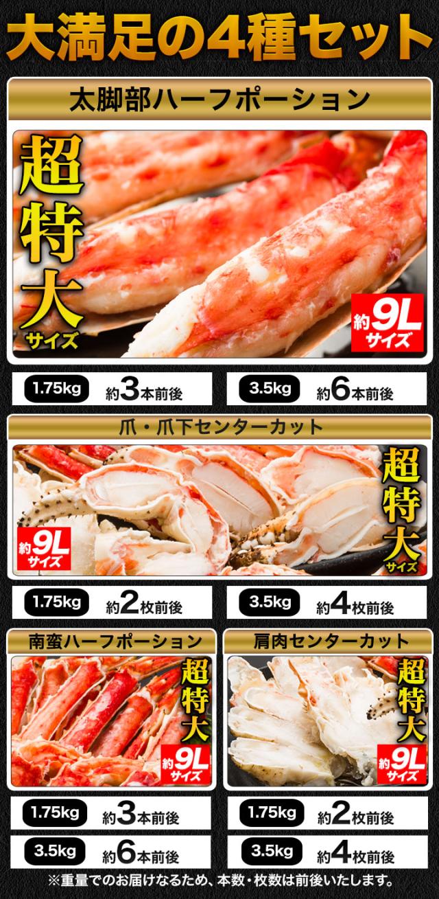 | 1.75kg(正味重量1.4kg) 太脚部ハーフカット:約3本 爪・爪下センターカット:約2枚 南蛮ハーフカット:約3本 肩肉センターカット:約4枚 3.5kg(正味重量2.8kg) 太脚部ハーフカット:約6本 爪・爪下センターカット:約4枚 南蛮ハーフカット:約6本 肩肉センターカット:約4枚 ※重量でのお届けのため、本数は前後いたします。 ・空気に触れることによる乾燥や酸化を防ぐため氷の被膜をつけてお届けいたします。 ・( )内の正味重量(正味)とは、氷の被膜をつける前のカニ正味の重量です。 ・商品のラベルにはカニ正味の重量を記載しています。 |
