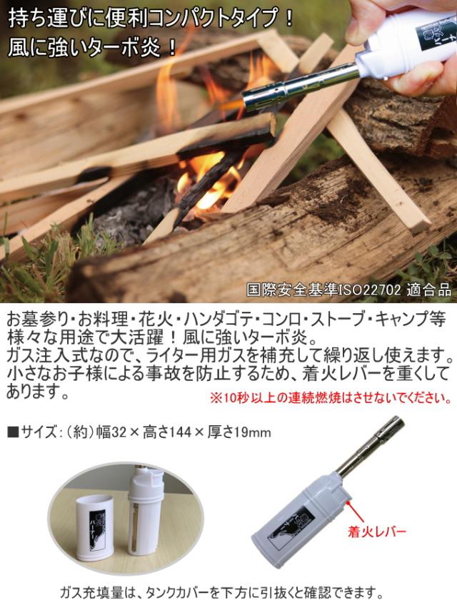 持ち運びに便利なコンパクトタイプ。 風が吹いても消えにくいターボ炎。 ガス注入式なので、ライター用ガスを補充して繰り返し使えます。 小さなお子様による事故を防止するため、着火レバーを重くしてあります。 |