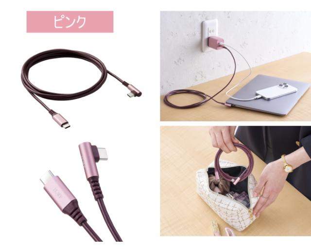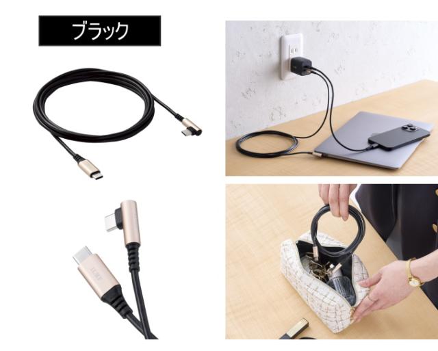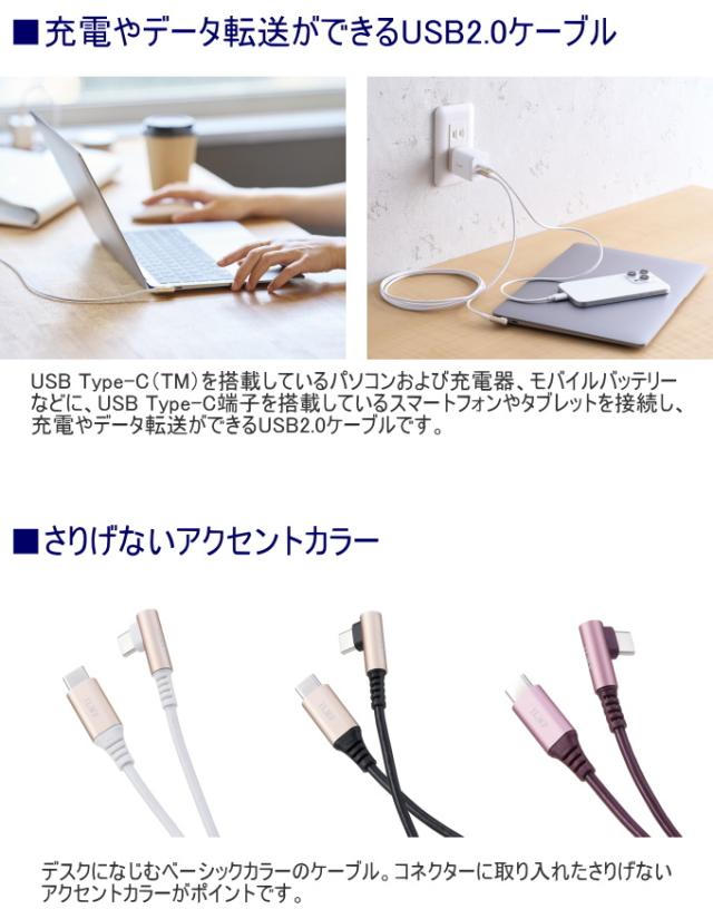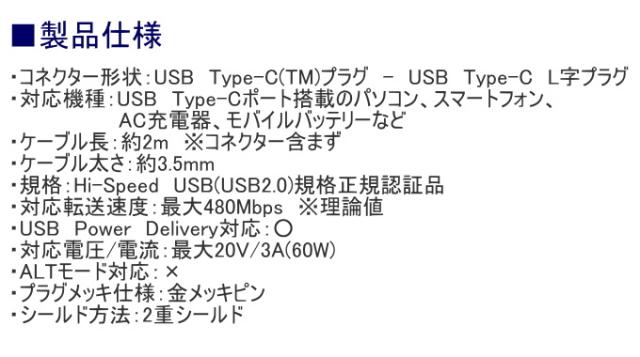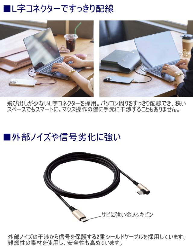 USB Type-C(TM)端子を搭載しているパソコンおよび充電器、モバイルバッテリーなどに、USB Type-C端子を搭載しているスマートフォンやタブレットを接続し、充電やデータ転送ができるUSB2.0ケーブルです。 デスクになじむベーシックカラーのケーブル。コネクターに取り入れたさりげないアクセントカラーがポイントです。 USB2.0の規格である「Certified Hi-Speed USB(USB2.0)」の正規認証品です。 飛び出しが少ないL字コネクターを採用。パソコン周りをすっきり配線でき、狭いスペースでもスマートに。マウス操作の際に手元に干渉することもありません。 USB Power Deliveryに対応し、最大60W(20V/3A)の大電流を送電可能です。 ※ご使用になるパソコンやAC充電器などの性能によって、供給される電流値が異なります。 外部ノイズの干渉から信号を保護する2重シールドケーブルを採用しています。 最大480Mbpsの高速データ転送が可能です。 難燃性の素材を使用し、安全性を高めています。 |