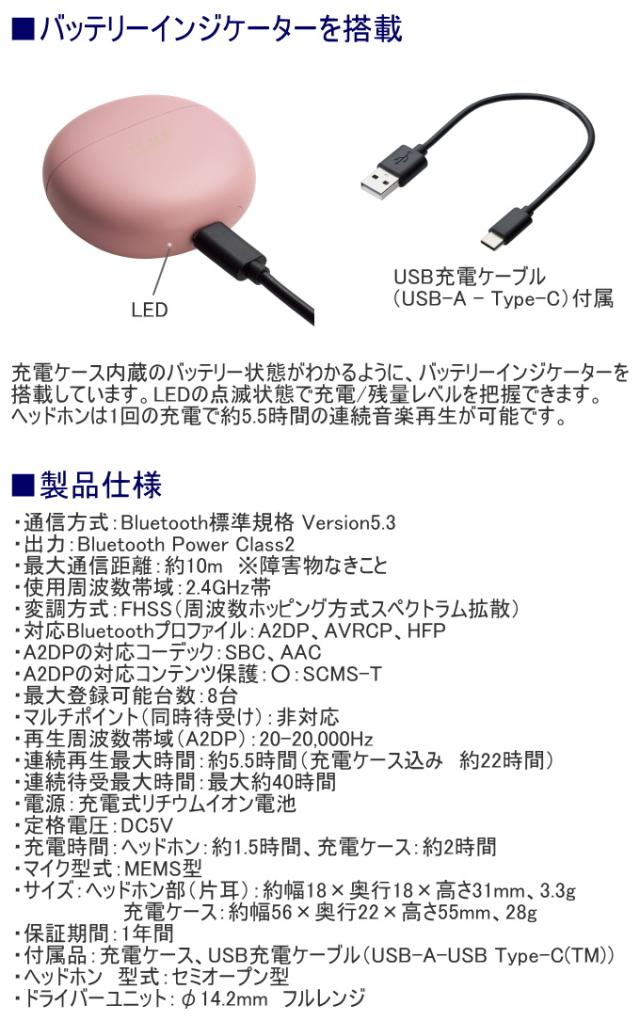 装着時も収納時もコンパクトな、セミオープンタイプのBluetooth(R)完全ワイヤレスステレオヘッドホンです。 手のひらに収まるサイズの充電ケースは、約22mmの薄さ。小さなバッグや服のポケットに入れてもシルエットが崩れず、スマートに持ち運べます。 タッチセンサーでサッと操作できるから、スマートフォンへ急な電話があったときの応答も簡単。パソコンなどのBluetooth(R)対応機器への接続も可能で、あらゆるビジネスシーンで活躍します。 充電ケースはまるくてコロンとした形がポイント。マットな質感で手に馴染むデザインです。 ヘッドホンは耳への負担を軽減し、周囲の音や話し声が聞き取りやすいセミオープンタイプです。耳への圧迫感が少なく、耳せんタイプが苦手な方にもおすすめです。 耳の形状に合わせたエルゴノミクスデザインによるフィット感と、片側わずか約3.3gの超軽量設計で、快適な装着感を実現しました。 タッチセンサーの採用により耳元での操作がスムーズかつショックレスで、ヘッドホンが耳からずれにくいです。 初期登録後は、充電ケースから取り出すだけでスマートフォンなどの機器と自動でペアリングします。 ヘッドホンは1回の充電で約5.5時間の連続音楽再生が可能です。 低遅延モード搭載でBluetooth(R)特有の映像と音の遅延を軽減し、ストレスなく動画視聴やゲームを楽しめます。 |