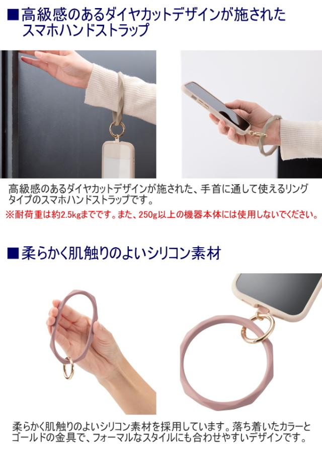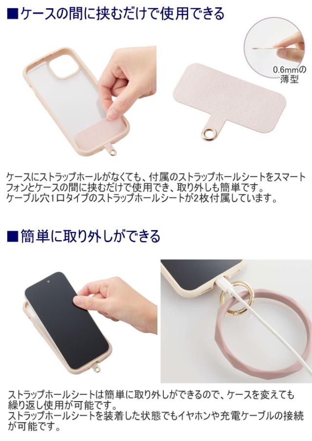 高級感のあるダイヤカットデザインが施された、手首に通して使えるリングタイプのスマホハンドストラップです。 手首や腕から提げて持ち歩けるので、両手がふさがらずいつでもサッとスマートフォンの操作ができます。 落ち着いたカラーとゴールドの金具で、フォーマルなスタイルにも合わせやすいデザインです。 柔らかく肌触りのよいシリコン素材を採用しています。 ケースにストラップホールがなくても、付属のストラップホールシートをスマートフォンとケースの間に挟むだけで使用でき、取り外しも簡単です。 ケーブル穴1口タイプのストラップホールシートが2枚付属しています。 ストラップホールシートは簡単に取り外しができるので、ケースを変えても繰り返し使用が可能です。 ストラップホールシートを装着した状態でもイヤホンや充電ケーブルの接続が可能です。 ケースにフィットする0.6mmの薄型のストラップホールシートで簡単に装着できます。 ストラップホールシートはハンドストラップ本体と同じカラーを採用し、統一感があるデザインです。 ケースの種類は、ハイブリッドケース、ソフトケースをご使用ください。(ケース背面が硬い素材のものを推奨します) シリコン製のケースには使用しないでください。 ケースは、ケーブル穴がケース底面の中央にあるものが推奨です。ケーブル穴部分が大きく開口しているケースでの使用は推奨しません。 |