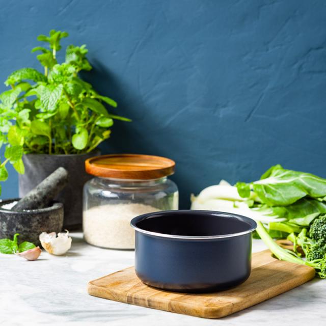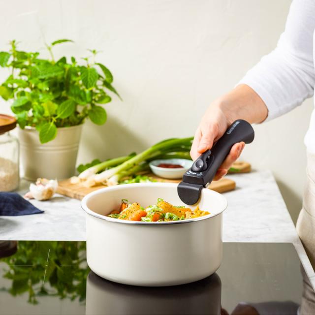 セラミックコーティングだからできる明るいカラーリングは、キッチンを華やかに演出します。シンプルなデザインで食卓にも馴染むため、調理後はハンドルを外してそのまま食卓へサーブするのもおすすめです。