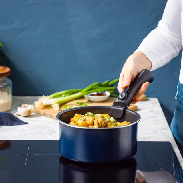 有害物質を含まないのに焦げ付きにくい、ハンドルが取り外せる安心加工のソースパン。