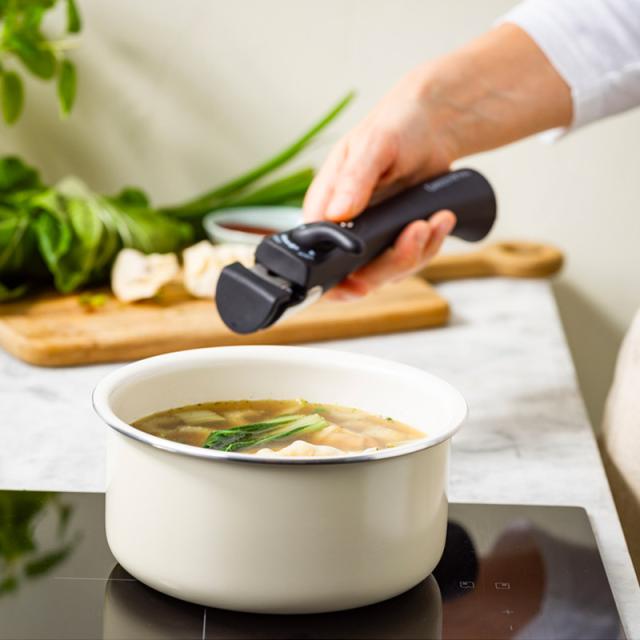 有害物質を含まないのに焦げ付きにくい、ハンドルが取り外せる安心加工のソースパン。