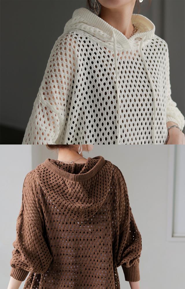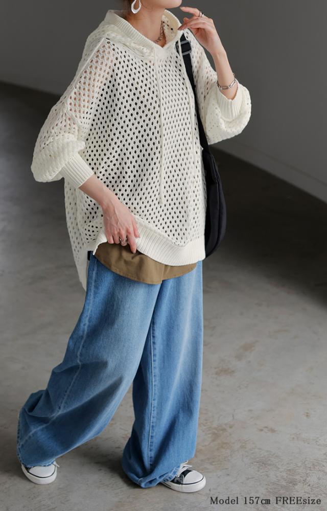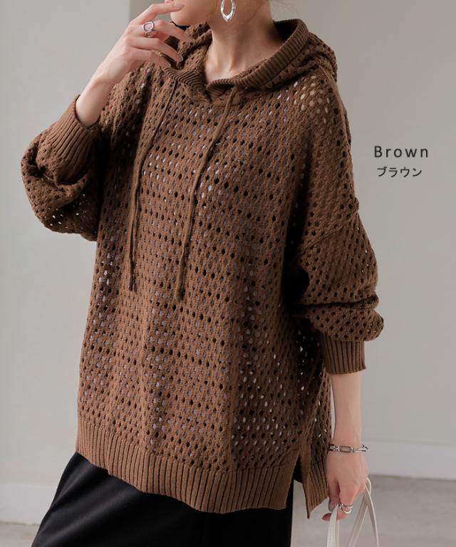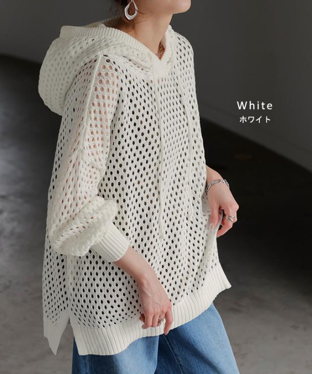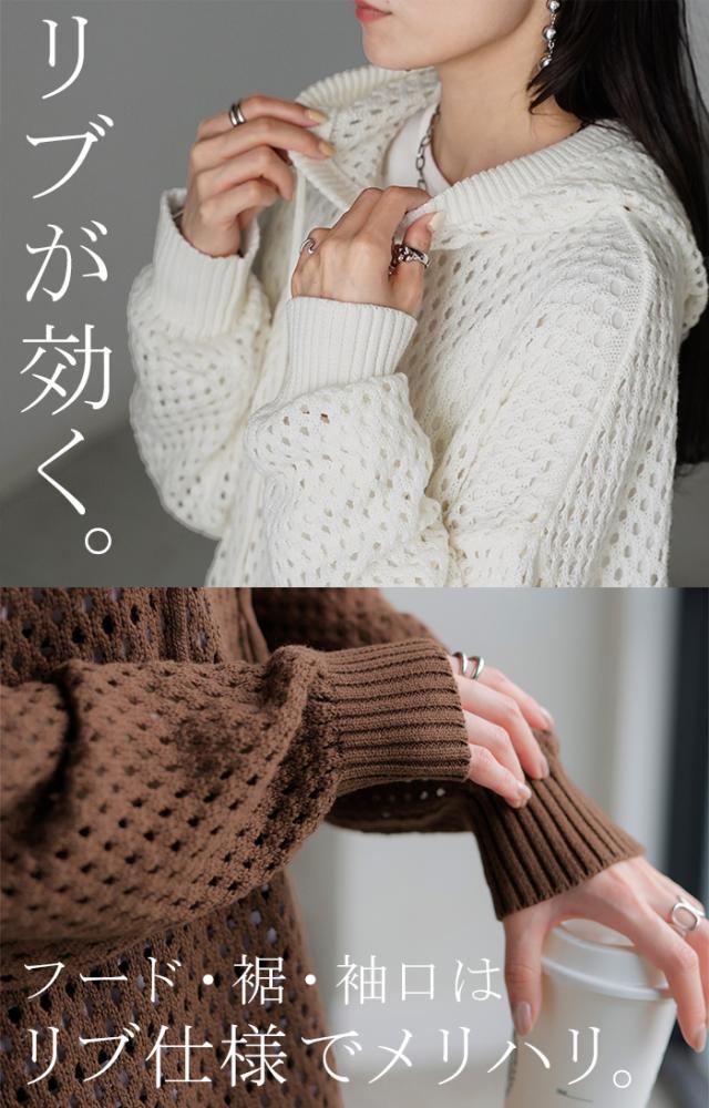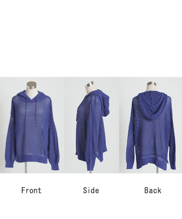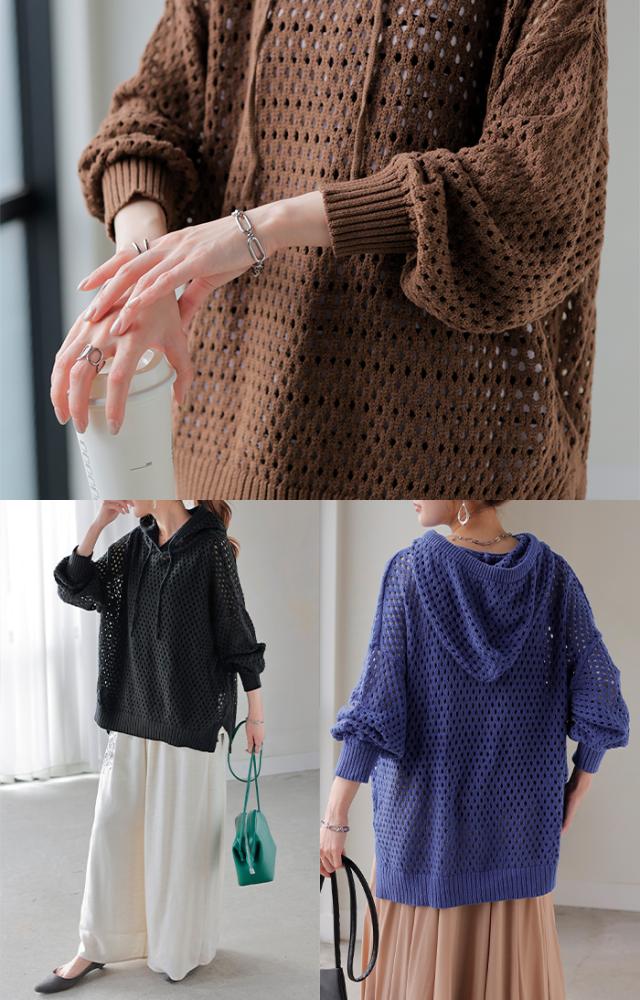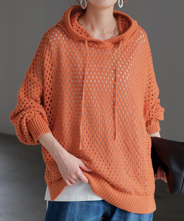 インナーによって違った雰囲気が楽しめるメッシュ編みプルパーカー。