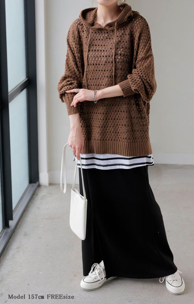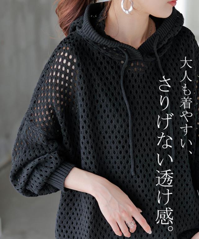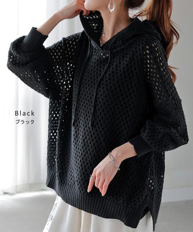 ニット 透かし編み パーカー フード ニットパーカー レディース フーディー セーター トップス ドルマン プルオーバー レイヤード ドルマンスリーブ ゆったり ロング メッシュ 重ね 体型カバー 大きいサイズ お尻が隠れる 黒 ブルー 春 夏 HUG.U