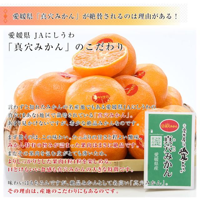 愛媛県JAにしうわのブランドみかん「真穴みかん」。粒々とした果肉1粒1粒には、みかん本来の旨みと甘みがたっぷり詰まっています。産地のこだわりを感じる、香り豊かで程よく酸味がある絶品みかん。ぜひこの機会にご賞味ください。