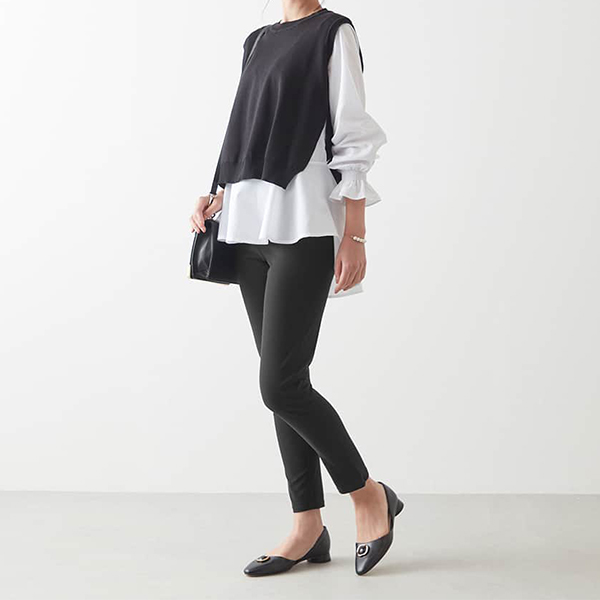 カジュアルな服装にも、オフィスシーンにも、家事や子育てなど、シーンを選ばず、季節も選ばずはける一品。