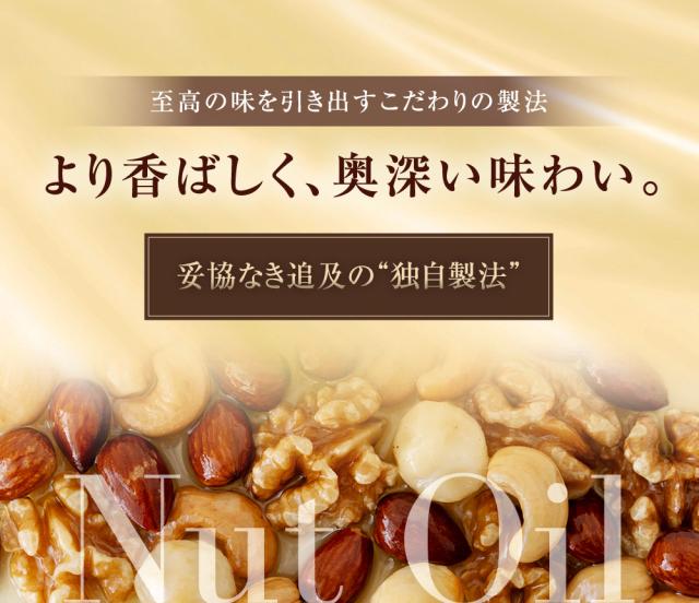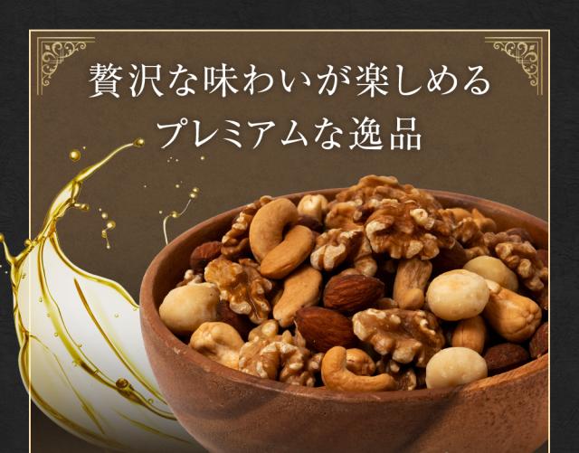 原材料名:オイルローストアーモンド(アーモンド(アメリカ)、食用アーモンドオイル)、オイルローストくるみ(くるみ(アメリカ)、食用くるみオイル)、オイルローストカシューナッツ(カシューナッツ、食用カシューナッツオイル)、オイルローストマカダミアナッツ(マカダミアナッツ、食用マカダミアナッツオイル)