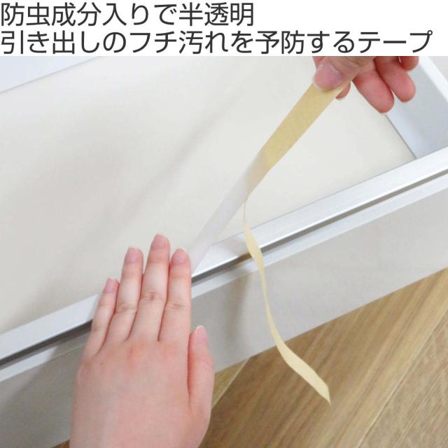 引き出しのフチの汚れを予防するための半透明の樹脂製テープです。フチが汚れてもテープを剥がすだけなので、掃除の手間が不要で予防掃除にぴったりです。表面に防虫剤を塗布しているので、害虫が触れると嫌がって逃げ出します。防虫成分が周囲に広がらず無臭なのも嬉しいポイントです。