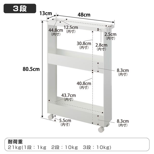 | サイズ | 幅13×奥行48×高さ80.5cm(キャスター含む) 内寸 1段:幅12.5×奥行44.8×高さ2.8cm 2段:幅12.5×奥行44.8×高さ30.8cm 3段:幅12.5×奥行44.8×高さ40.8cm |