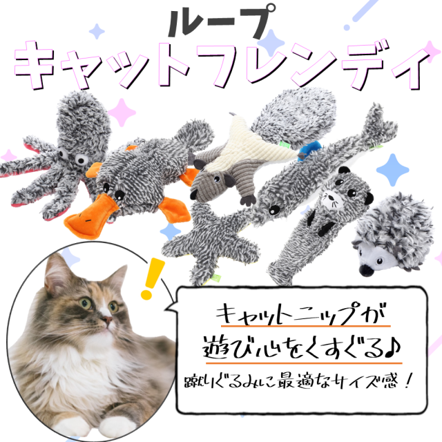 「ループ キャットフレンディ」は、猫好きが考えた、バラエティー豊かなキャットトイシリーズです。触り心地のよい起毛素材を使い、リアルかつ蹴りぐるみに最適なサイズ感を実現しました。