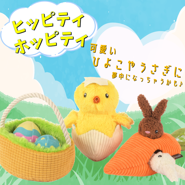 P.L.A.Y.(プレイ)のプラッシュトイ「Hippity Hoppity(ヒッピティホッピティ)」シリーズが新登場!卵の中から出てきたのはひよこ??人参の中から出てきたのは・・・うさぎ ??エッグバスケットの中にはカラフルな卵が・・・!!見ているだけで癒される可愛らしいおもちゃです。おもちゃの場所によってプープーなったりカシャカシャなったり愛犬を飽きさせません。
