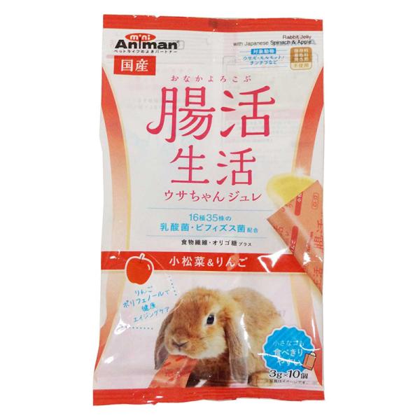 腸内フローラを整えるジュレタイプのぷるるんおやつです。複数の乳酸菌・ビフィズス菌(16種35株)を配合。食物繊維・オリゴ糖などウサギの腸の健康を考えた素材を加えました。 りんごポリフェノールで健康エイジングケア。 保存料、着色料、発色剤不使用。 小さなコも食べきりやすい!3g個包装。 手からあげてコミュニケーションに!ごほうびに!モルモット・チンチラにも。
