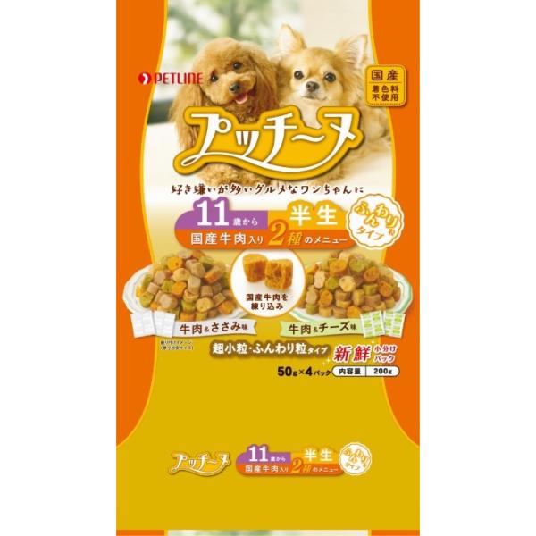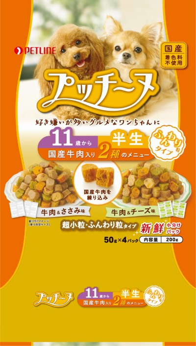 | ペットライン いぬのしあわせ プッチーヌ 11歳からの高齢犬用 半生 ふんわりタイプ 国産牛肉入り 2種のメニュー 牛肉&ささみ味 牛肉&チーズ味 超小粒・ふんわり粒 200g | |